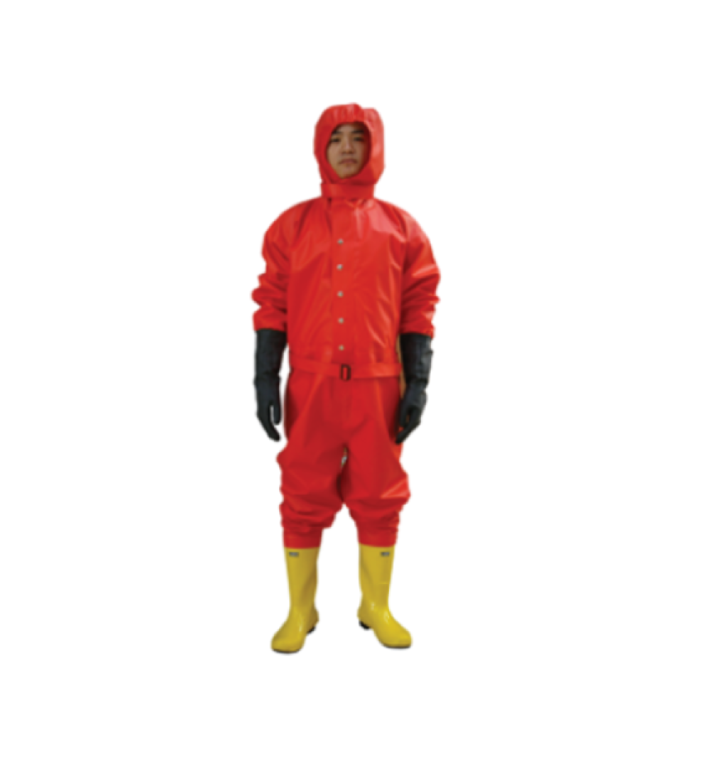 (2). Đeo mũ bảo hộ hóa chất, chỉnh sửa vải bảo vệ ngực của bộ đồ, đậy lại vải bảo vệ ngực sau khi gấp lại, và ấn nút bấm vào ngực xuống.